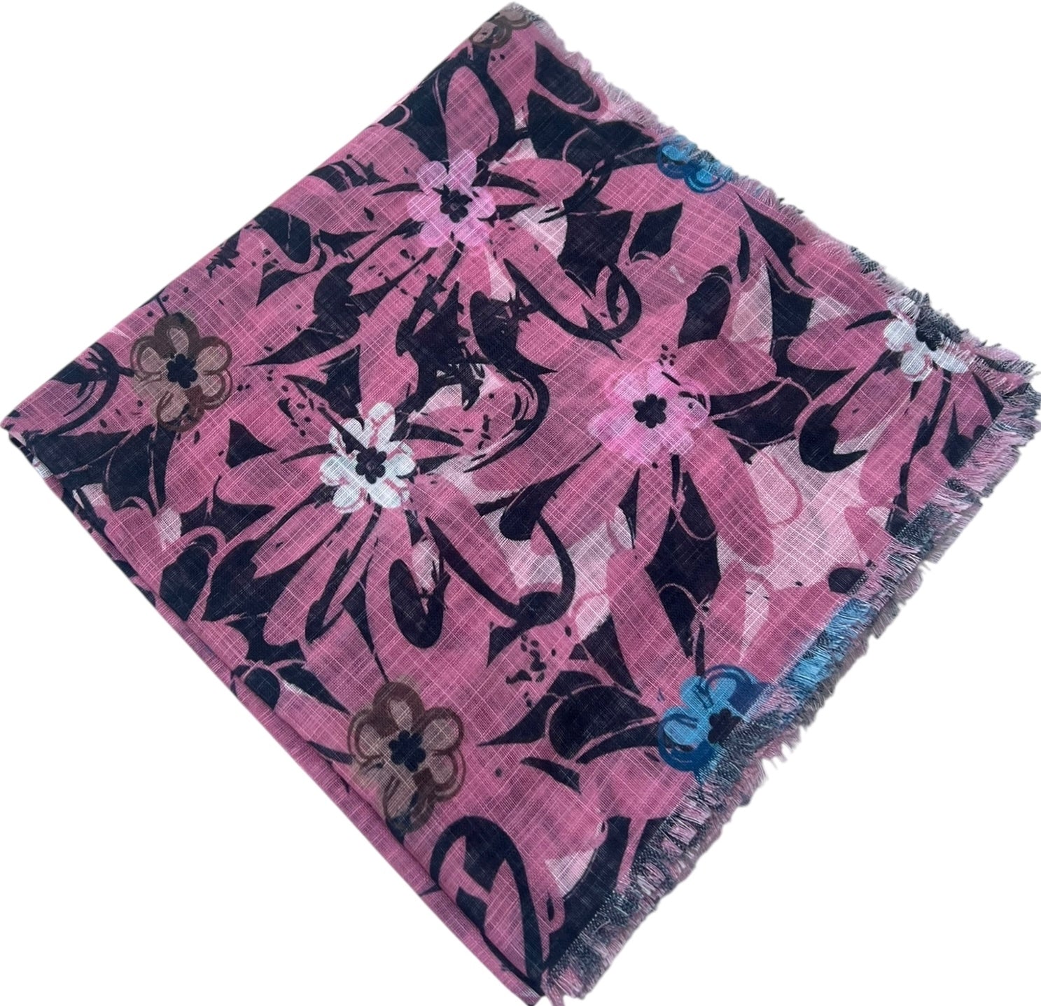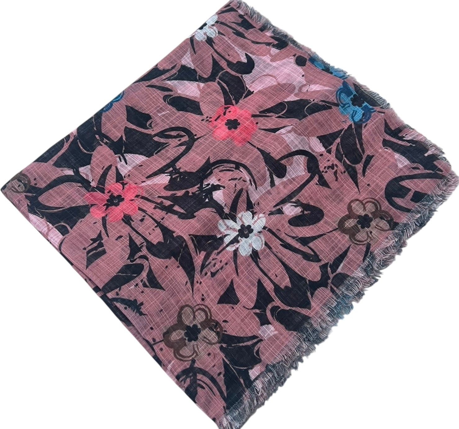 Crafted from a cotton blend with fringed edges, our Flowers in Bloom collection features a beautiful floral design with a mix of bold and delicate elements. The flowers are intricately detailed with various sizes and shapes, and are scattered across the fabric in a seemingly random yet harmonious arrangement. The leaves and stems, also intricately designed, add depth to the overall pattern. The design has an organic, hand-drawn feel, giving it a unique and charming quality.