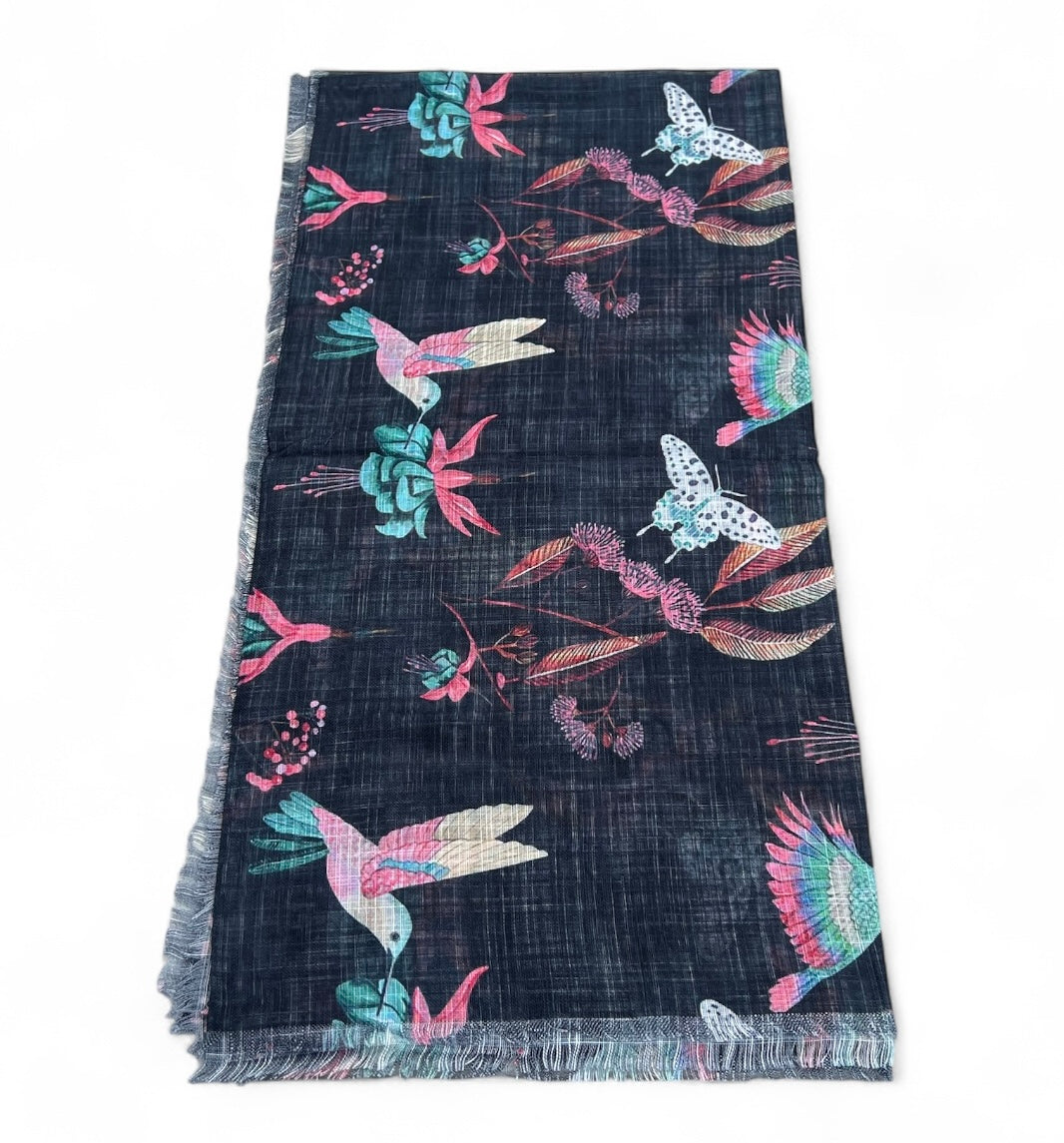 Crafted from a cotton blend with fringed edges, this scarf features a charming pattern of hummingbirds and flowers on a textured background. The overall aesthetic is playful yet sophisticated, making it a lovely addition to your scarf collection.