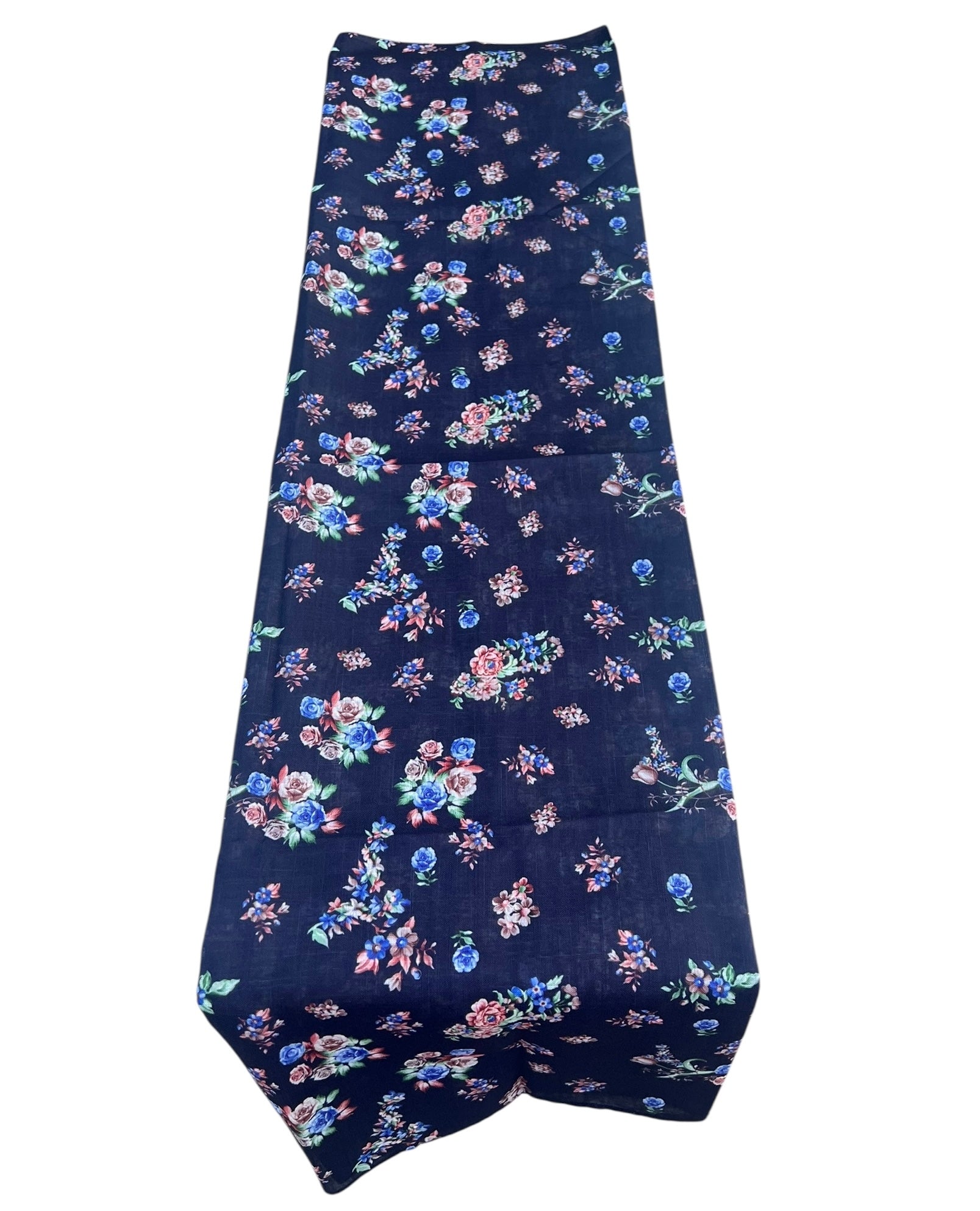 Crafted from a cotton blend, the Peony Paradise scarf is beautiful, comfortable, and durable. Straight edges/non fringe. The scarf features a floral pattern and leaves. The flowers are depicted in various stages of bloom, adding depth and visual interest to the design. The leaves are scattered throughout the pattern, complimenting the flowers and creating a lush, garden-inspired look.
