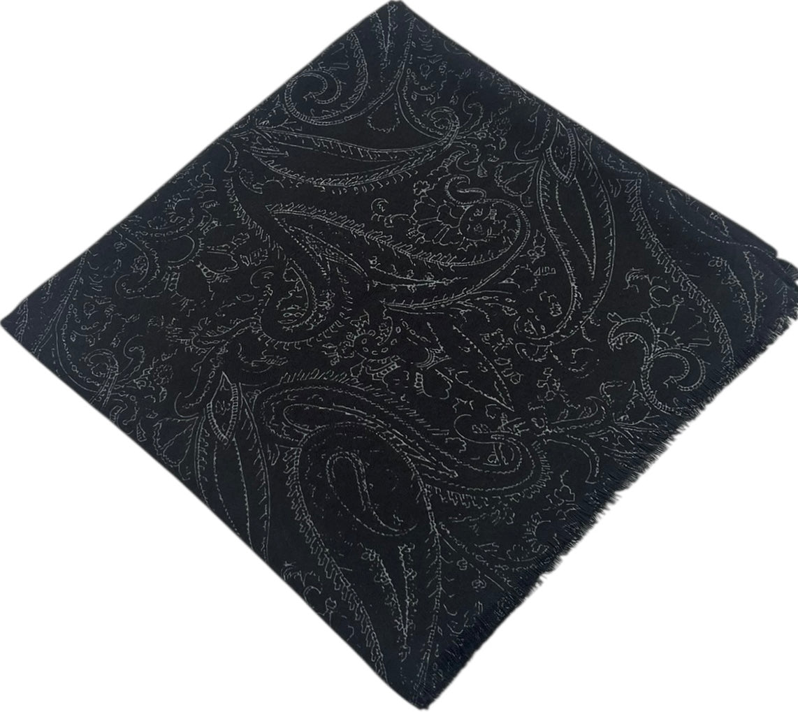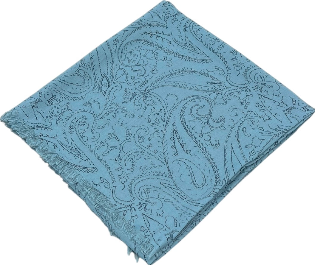 Crafted from a cotton blend fabric, the "Sketched Paisley" scarf features an intricate paisley pattern of swirling teardrop motifs and delicate floral accents, creating a textured, embossed effect with looping organic shapes adding a lush, elegant touch,
