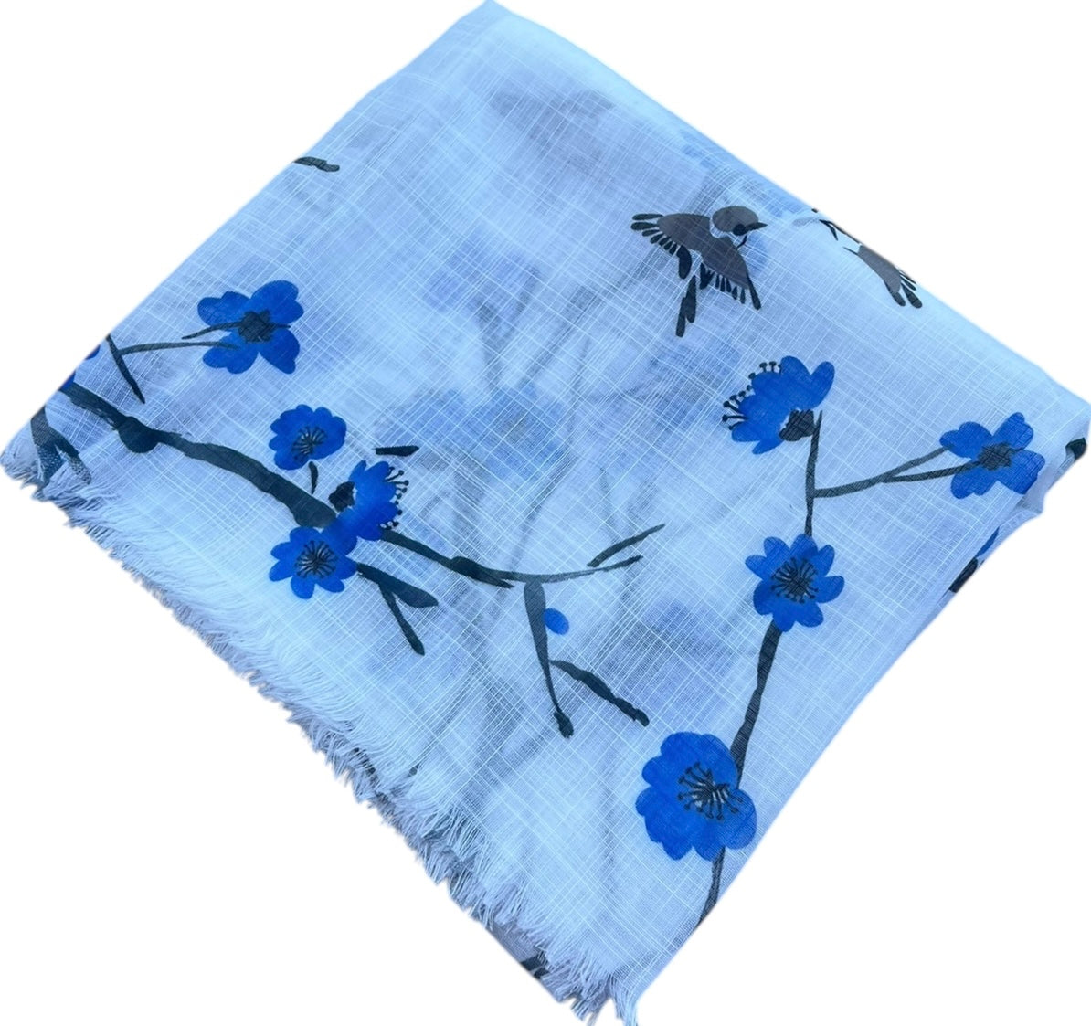 Elevate your tichel style with the gorgeous Songbird Serenity Scarf featuring a delicate deisgn with blue flowers and branches paired with birds. Crafted from a cotton blend with fringed edges, this flowy scarf is the perfect addition to your tichel collection.