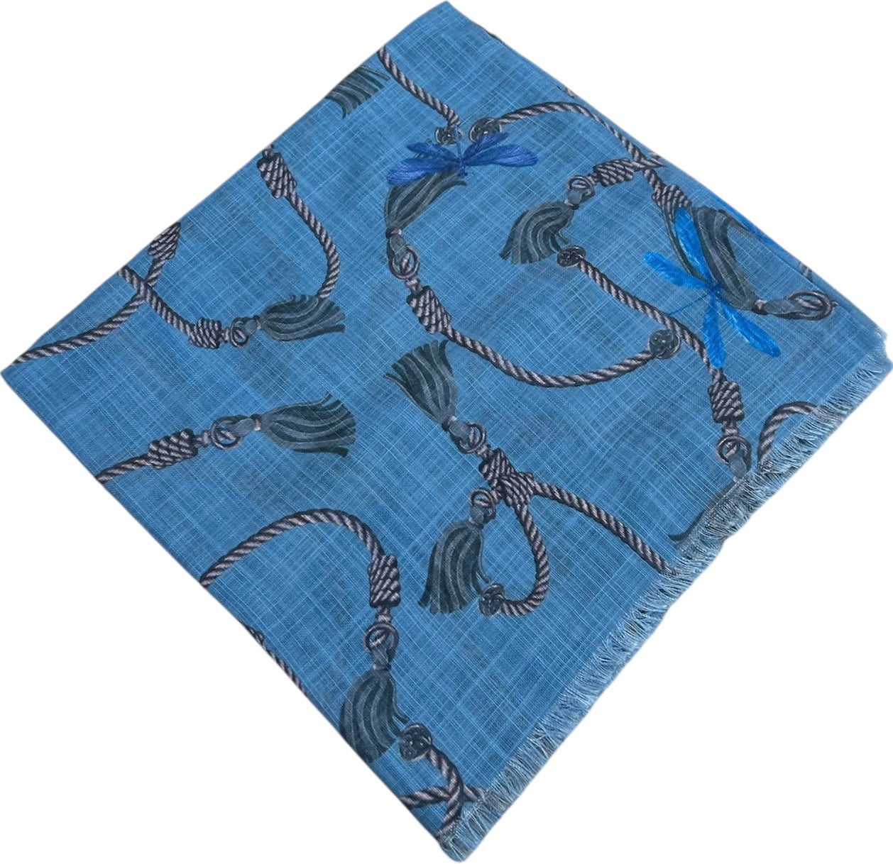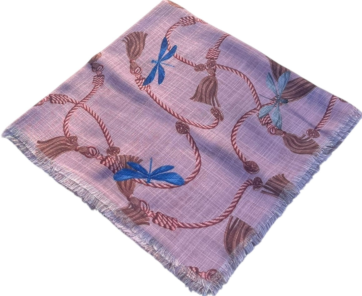 Crafted from a cotton blend with fringed edges, the Tassels and Wings scarf features a pattern of ropes with tassels, intertwined with dragonflies, creating a decorative and textured design.