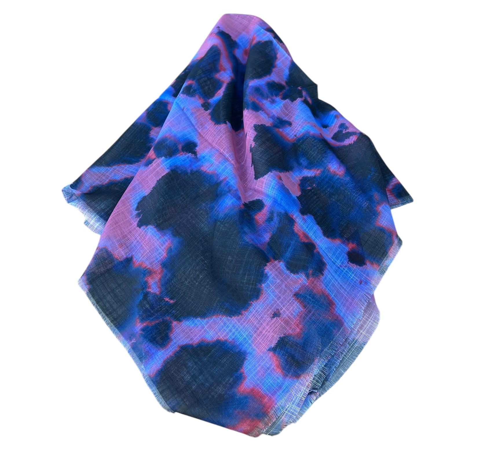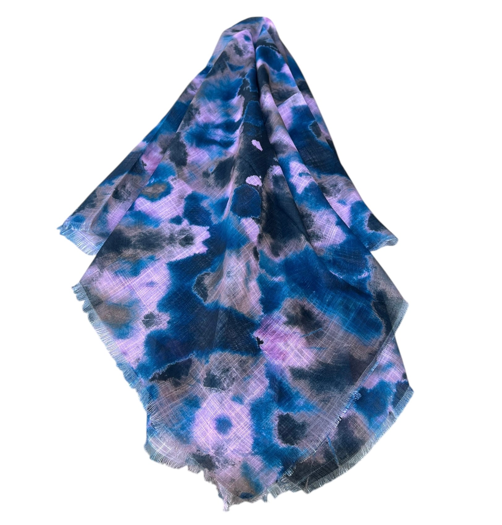 Crafted from a cotton blend with fringed edges, the tie-dye scarf features a unique blend of abstract shapes and swirling designs, creating a visually striking effect.